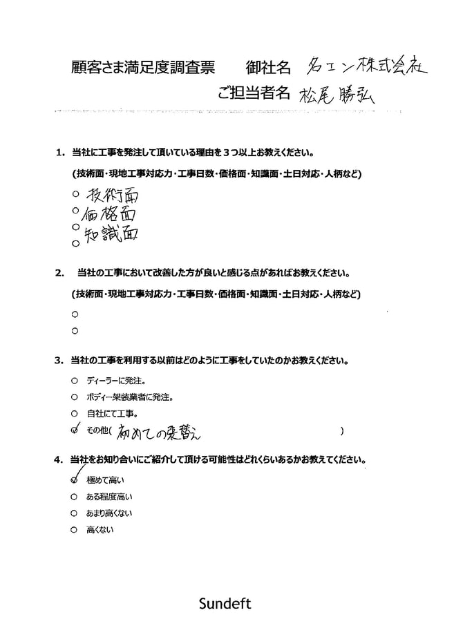 顧客さま満足度調査票へのご記入のご協力をも頂き、「お知り合いにご紹介頂けるか」の項目に高評価を頂き、大変うれしく思い、今後の励みになりました。