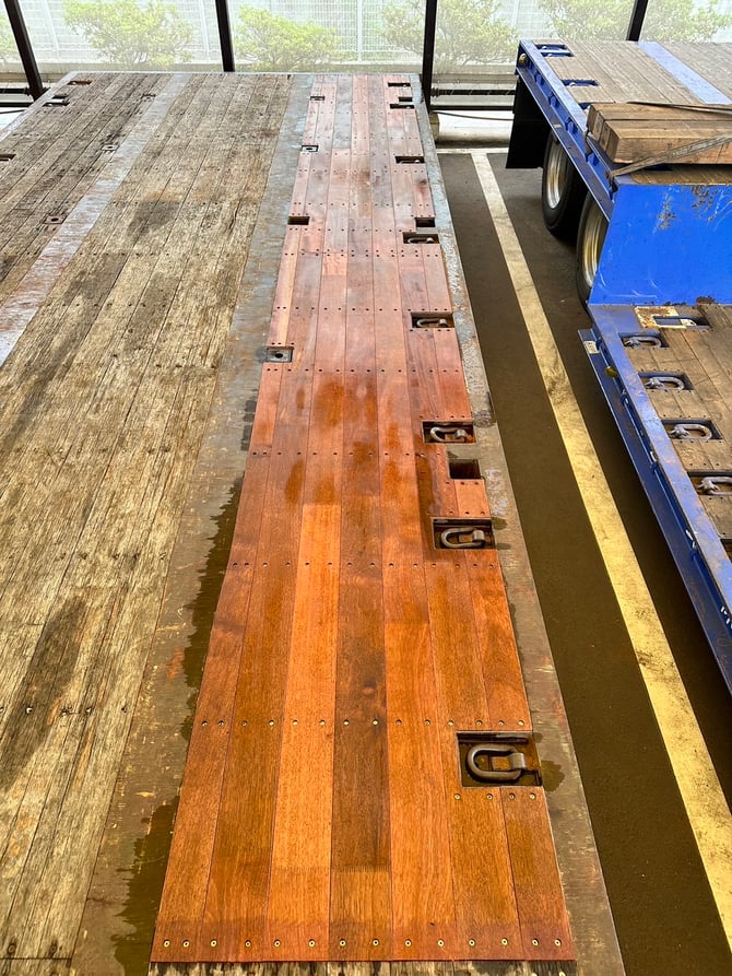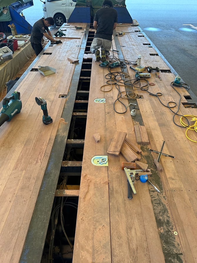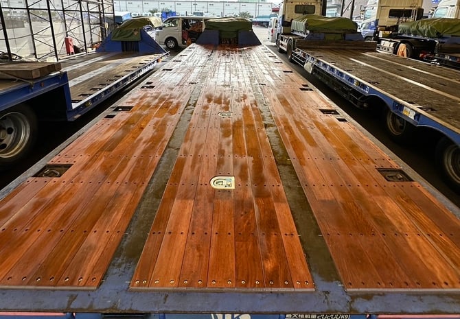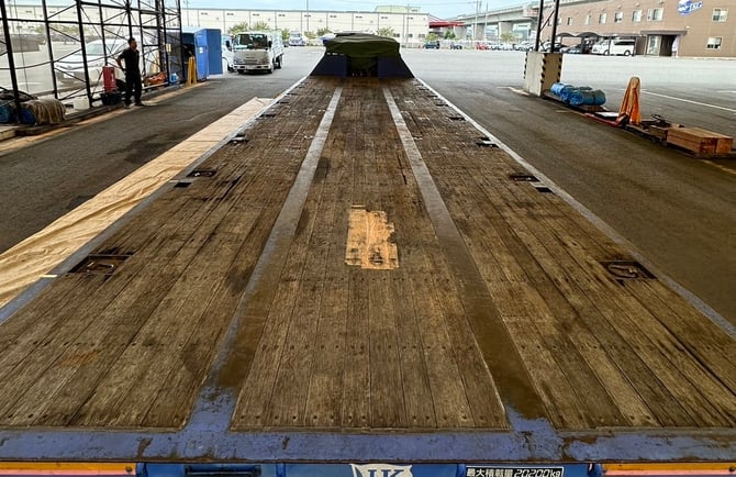 6月末ごろに予備台車の部分張替えと、今月に中低床台車の全面張替え+埋め込みフック増設の工事です。